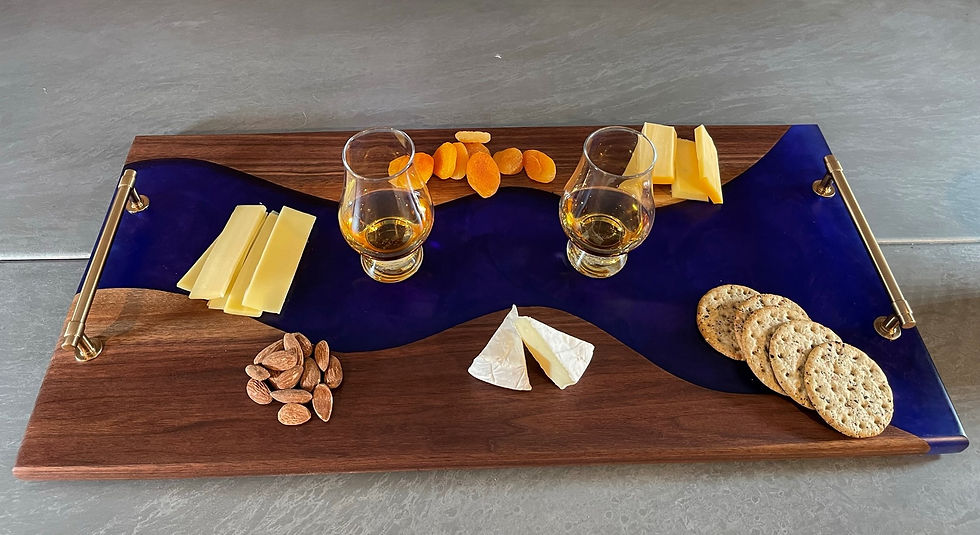 Cherry wood and Cobalt Blue epoxy serving board with black handles
